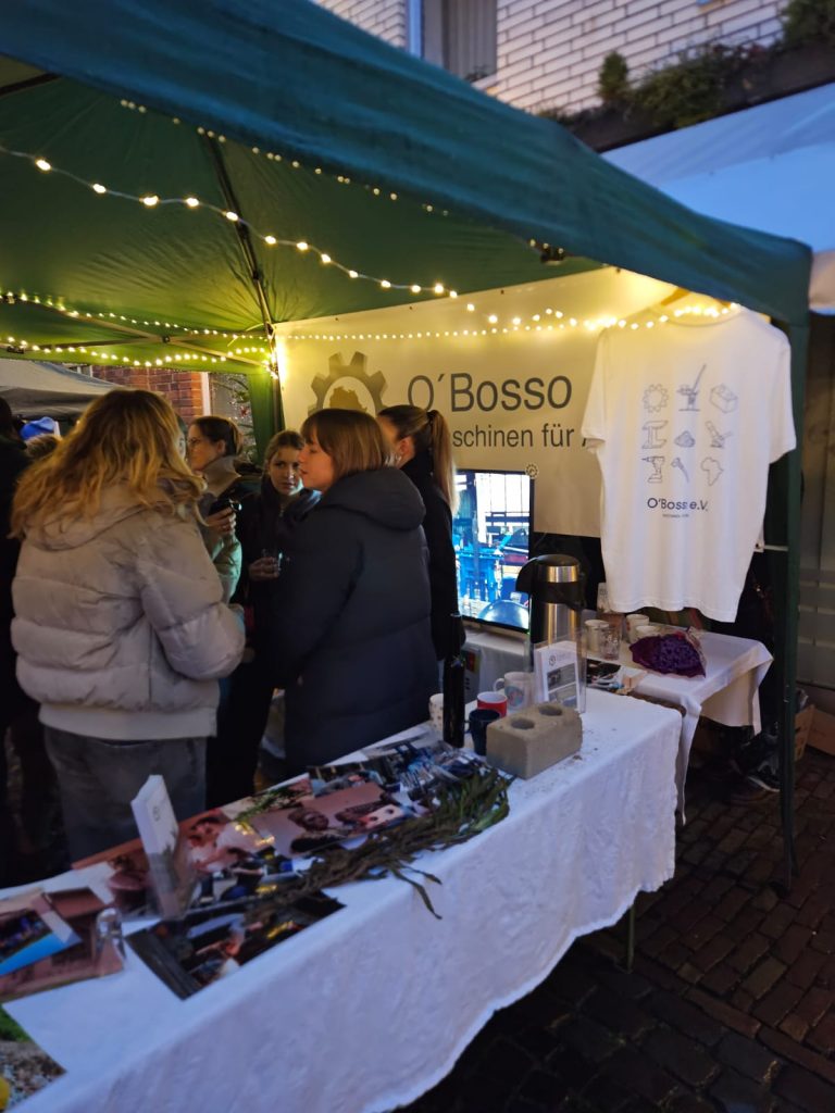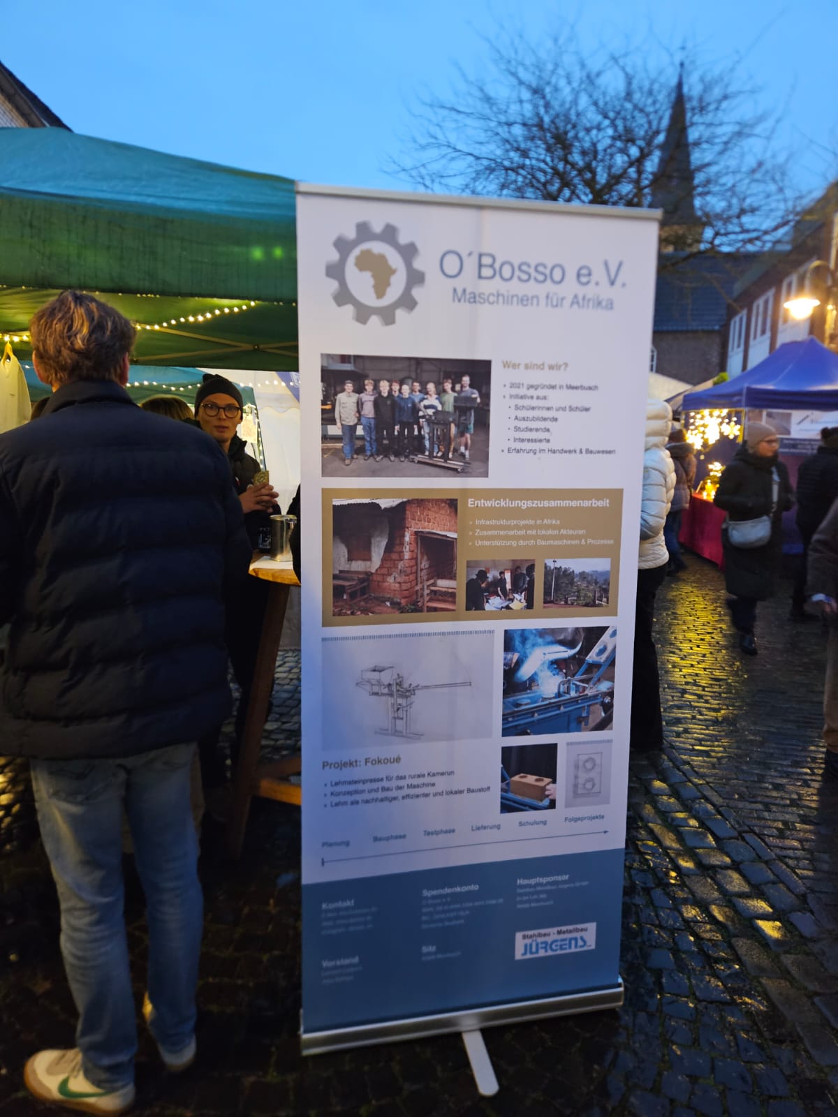 Auch in diesem Jahr durften wir unseren Verein O’Bosso e.V. wieder auf dem Nikolausmarkt in Meerbusch Lank-Latum präsentieren, diesmal mit ganz besonderen Eindrücken im Gepäck. Nach der erfolgreichen Übergabe unserer Lehmsteinpresse in Kamerun konnten wir vor Ort von unseren Erlebnissen, Begegnungen und dem Projektabschluss in Fokoué berichten.